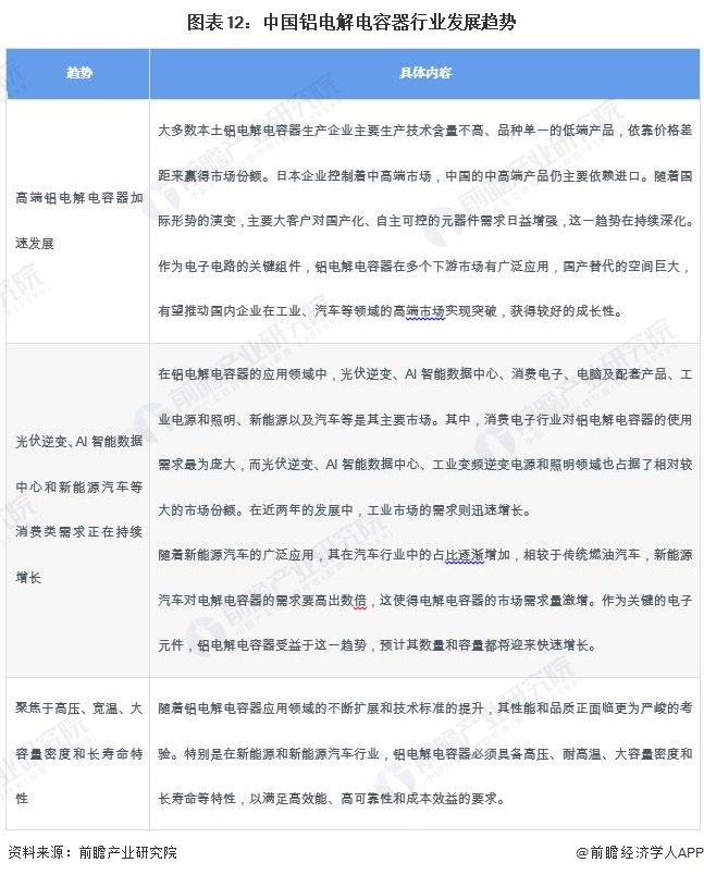未来,中国铝电解电容器行业将呈现高端铝电解电容器加速发展、光伏逆变,AI智能数据中心和新能源汽车等消费类需求正在持续增长以及聚焦于高压、宽温、大容量密度和长寿命特性等发展趋势。