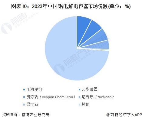 根据2023年行业内代表性上市公司的销售情况来看,江海股份占据国内铝电解电容器行业市场份额约7.6%,艾华集团约为6.8%,绿宝石约0.6%。