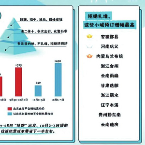 除了错峰“整顿”黄金周,这届游客也更偏爱去小众景区,拒绝“挤”。去哪儿平台搜索数据显示,“人少”“小众”“反向”是国庆期间搜索热度蹿升幅度最高的词汇。酒店预订数据也显示,节日期间预订增幅最高的是小城和县城。Top10增幅最高的目的地是:安徽黟县、河南巩义、内蒙古乌兰布统、浙江台州、云南雨崩、甘肃迭部、浙江丽水、辽宁本溪、贵州黔东南、云南迪庆。这些目的地多半靠近景色优美的赏秋地,也相对“小众”。