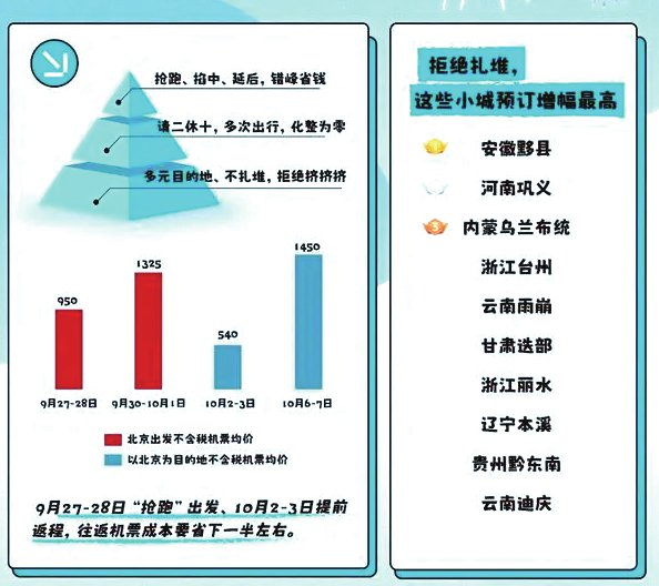 去哪儿大数据显示,错峰出行,单机票成本就能省下一半,更能避开“人从众”的拥挤景区。9月27~28日,第一批“抢跑”国庆出游的旅客就出发了,他们的回程高峰在10月2~10月3日。以北京为例,抢跑出发国内航线机票预订均价裸价是950元,较9月30日~10月1日出行高峰低三成;而提前返程机票均价是540元,更比10月6~7日返程高峰机票均价低六成以上;一来一回,错峰出行机票价格相当于打五折。