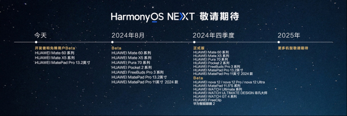 10月8日,HarmonyOS NEXT正式开启公测,首批公测机型包括HUAWEI Mate X5系列、HUAWEI MatePad Pro 13.2英寸系列、HUAWEI Mate 60系列。
