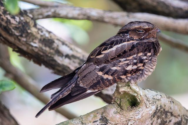 例如这张低速快门拍摄的夜鹰照片,我们在树林深处发现了一只在休息的夜鹰。通过降低快门速度,我们使用1/80s依然可以轻松拍摄清晰的影像。