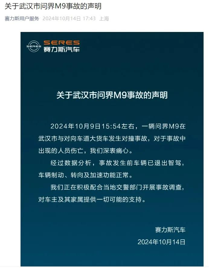 10月14日,赛力斯汽车官方发布关于武汉市问界M9事故的声明。