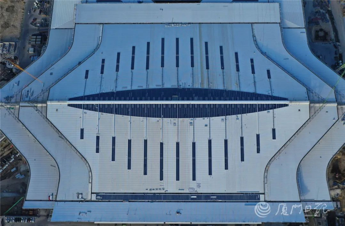 从高空俯瞰,翔安机场航站楼金属屋盖及玻璃幕墙均已基本完成,只剩细节需要雕琢;走进航站楼仰望,投影面积13.1万平方米船型天窗屋盖洒下天光,26条东西走向的采光天窗带犹如龙舟船桨;支撑起这巨大船型屋盖的是4根“擎天”开花柱,单根开花柱重达358.7吨。