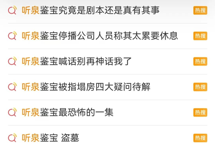 此前,博主“听泉鉴宝”在直播间宣布将短暂停播,休息几天,停播时间大约一个星期。在粉丝表示“电子榨菜休息了,自己的快乐也没了”的同时,博主“听泉鉴宝”的学历问题、“盗墓者”现场连麦是否为剧本、是否为纯公益鉴宝等话题也频上各大平台热搜前十——所以,在过去一周里,“听泉鉴宝”近乎天天上热搜。