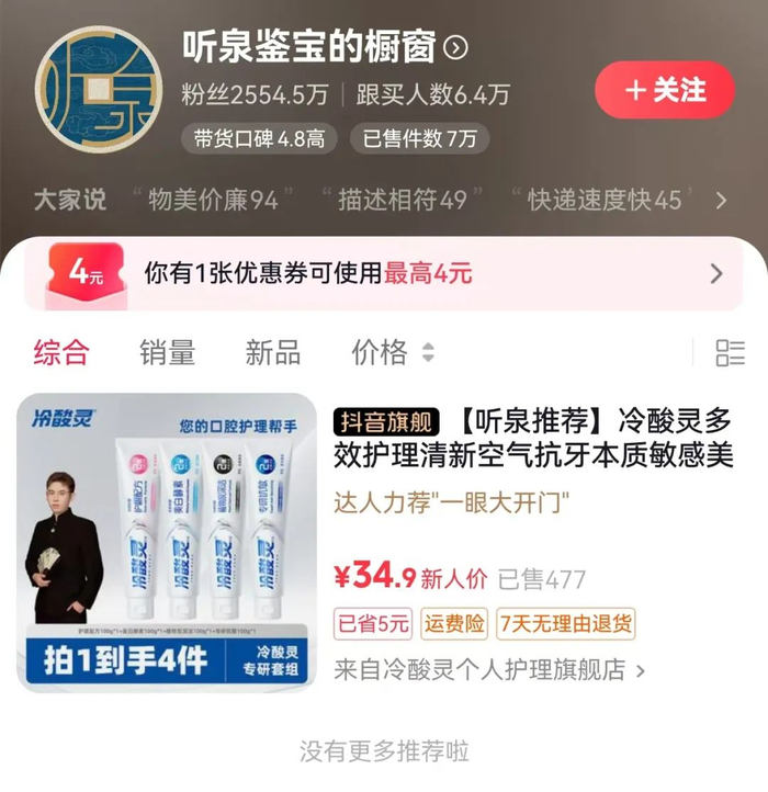 据悉,“听泉鉴宝”的商品橱窗此前上架了25件商品。尽管账号停播数日,商品橱窗的跟买人数仍在增加,截至10月15日,跟买人数上涨至6.4万人,已售件数显示为7万。10月15日中午,账号商品橱窗仅剩1件商品。