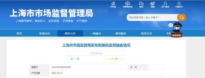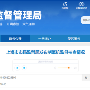 上海市市场监管局发布制氧机监督抽查情况