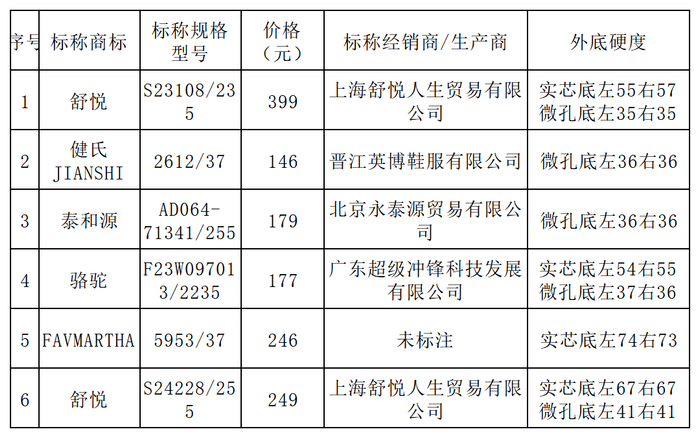 标称由上海舒悦人生贸易有限公司经销/生产的舒悦牌云弹健步女鞋(标称规格型号为S23108/235),实芯底左55右57,微孔底左35右35;标称由晋江英博鞋服有限公司经销/生产的健氏JIANSHI牌休闲鞋(标称规格型号为2612/37),微孔底左36右36;标称由北京永泰源贸易有限公司经销/生产的泰和源牌男单(布鞋)(标称规格型号为AD064—71341/255),微孔底左36右36。