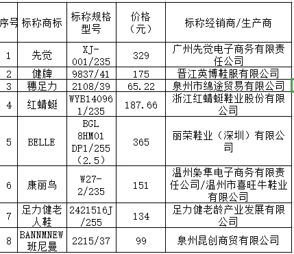 综合来看,有8款样品在耐穿性、舒适性、防滑性等方面均表现较好。如标称由广州先觉电子商务有限责任公司经销/生产的先觉牌女鞋(标称规格型号为XJ—001/235);标称由晋江英博鞋服有限公司经销/生产的健牌女跑鞋(标称规格型号为9837/41)等。