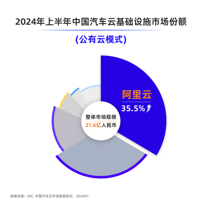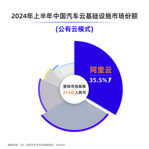 今日,国际数据公司(IDC)最新发布的《中国汽车云市场(2024上半年)跟踪》。报告显示,中国汽车厂商正积极拥抱公有云,在汽车云基础设施市场中,公有云占比提升至64%,其中阿里云市场份额进一步提升至35.5%,连续四年稳居第一。