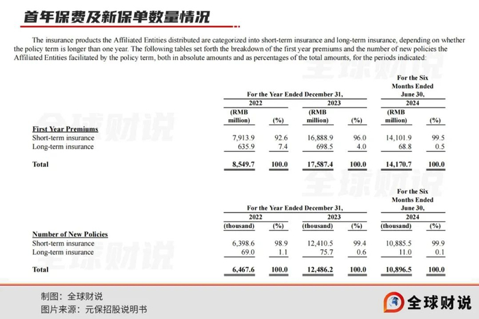 2022年、2023年及2024年上半年,元保的长期险首年保费收入分别为6.36亿元、6.99亿元及6880万元,占保险分销服务收入的比例分别仅为7.4%、4.0%及0.5%,短期险各期占比则均超过九成。
