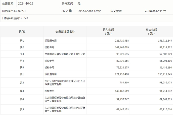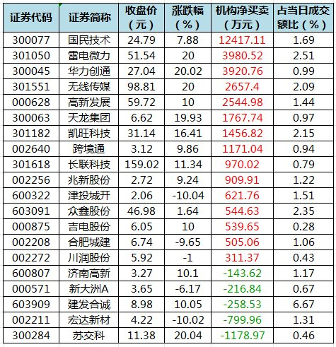 龙虎榜机构净买入15股国民技术居首