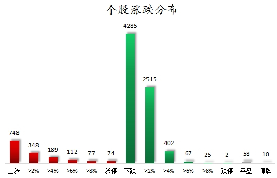个股涨跌情况,截至收盘,沪深两市合计748只个股上涨,4285只个股下跌,平盘个股58只,停牌的个股10只。不含当日上市新股,共有74只个股涨停,2只个股跌停。