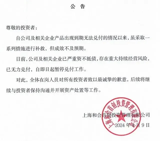 而4月9日,和合首创投资口径“急转直下”,表示公司及相关企业严重资不抵债,存在重大经营风险,已无力兑付,自即日起暂停兑付工作。
