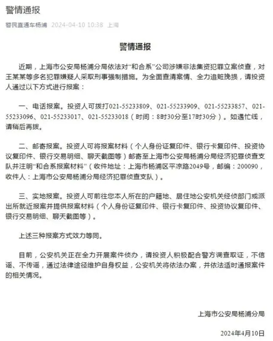 2024年4月,上海警方依法对“和合系”公司涉嫌非法集资犯罪立案侦查,对王某某等多名犯罪嫌疑人采取刑事强制措施。