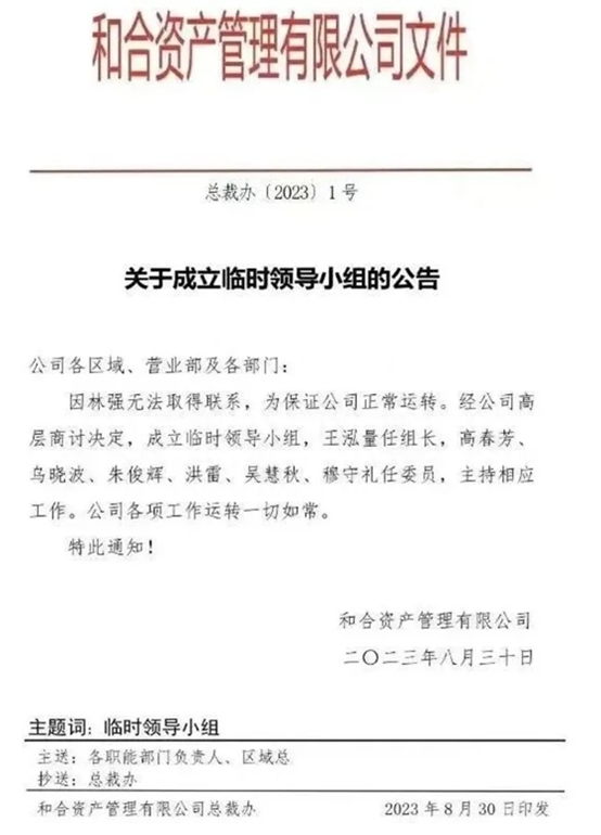 8月31日,有“和合系”相关文件显示,因与林强无法取得联系,公司成立临时领导小组。据说,林强在与“和合系”高管香港聚会后,就跑路到了新加坡。