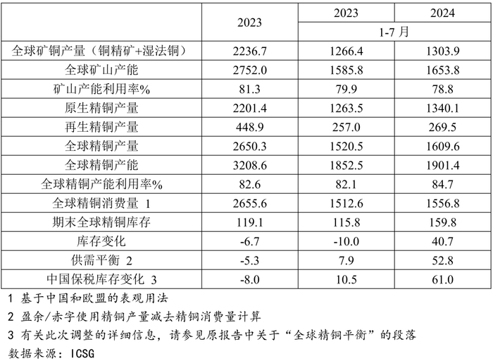 国际铜研究组(ICSG)在其最新的2024年9月铜月报中公布了截止2024年7月全球铜供需的数据,包括矿铜和精铜产量、精铜消费量等。