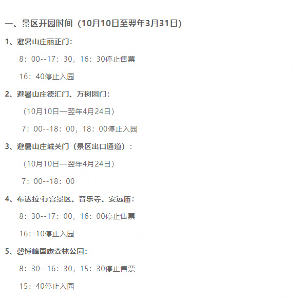 避暑山庄及周围寺庙景区自2024年10月10日起,调整对外开放时间,具体如下: