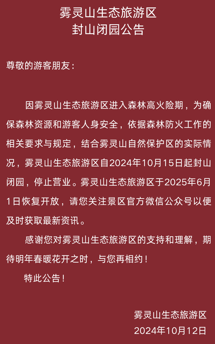 雾灵山生态旅游区自2024年10月15日起封山闭园,停止营业,于2025年6月1日恢复开放。