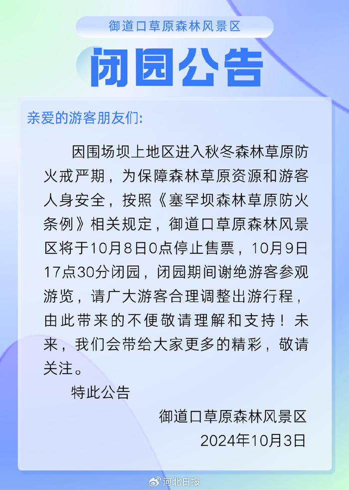 御道口草原森林风景区于10月9日17点30分闭园,闭园期间谢绝游客参观游览。