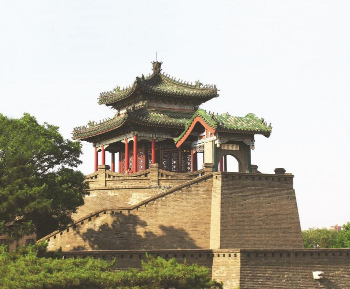 武灵丛台的最顶层呈圆形,直径19米,原名“武灵台”。明嘉靖十三年(1534年),兵备副使杨彝建亭于台上,名“据胜亭”。亭内设有赵武灵王的雕像,只见他手按佩剑,手抚长髯,似在检阅军队骑射,又似在观赏着和平繁华的盛世图景。这里是武灵丛台最高处,站立此处,半个邯郸城的风景近在眼前。天高云淡,艳阳高照,向远处望去,一座座现代化的摩天大厦拔地而起。