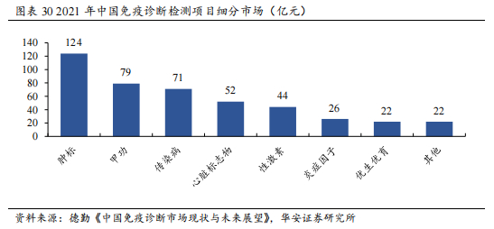 我国免疫诊断市场前两大细分领域肿标、甲功进口替代空间较大,公司先发制人。公司在肿瘤标志物(肿标)、甲状腺功能(甲功)两项具有领先的技术优势,此两项为我国免疫诊断检测市场占比前二:根据德勤《中国免疫诊断市场现状与未来展望》报告指出,2021 年我国肿标和甲功占中国细分市场前二,分别为 124 亿元和 79 亿元。公司依托多年积累的保有量和新增装机优势,以机带量实现试剂端快速增长,在试剂占据我国前两大细分领域,契合国内化学发光市场偏好。