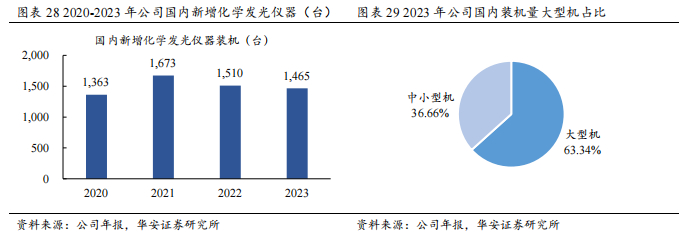 公司国内化学发光仪器装机量稳定增长,大型机占比高,新品持续推出。公司大型机 X8 凭借其多项性能指标领先,其入院速度持续增长。此外,拥有更多试剂位的大型机占装机量比例逐步提升,2023 年大型机占比高达 63.34%。