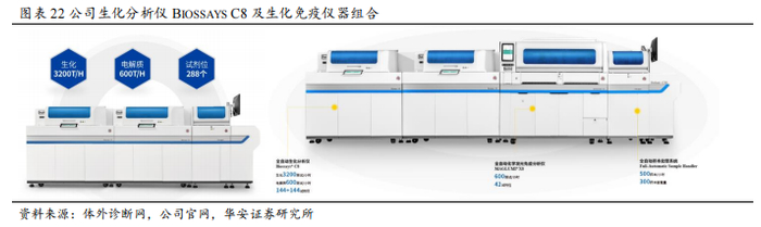 公司战略性布局生化领域,重视生免结合,纳入流水线版图。公司已在生化领域布局 13 年,耐心提升产品技术与质量,持续优化成本,已经初步掌握高端生化产品核心技术。据公司透露,公司在生化领域拥有至少十年的未来布局。公司全自动生化分析仪 Biossays C8 上市,拥有 3200T/H 极速检测性能、1 min 急诊样本立检功能、开盖模块自动去盖原盖加盖功能,且配套试剂溯源准确可靠,极大满足中大型实验室日常检测需求。