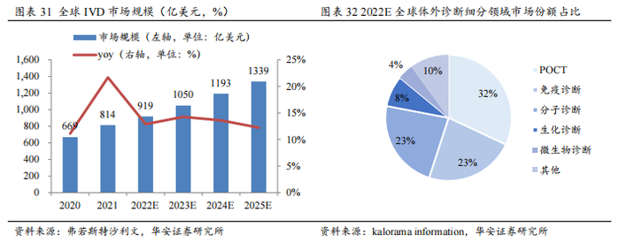 2023 年海外 IVD 市场突破千亿美元,免疫诊断市场占近四分之一。据弗若斯特沙利文,全球 IVD 市场规模于 2023 年突破千亿美元大关,且于 2025 年达到 1339 亿美元的规模;其中 2022 年全球免疫诊断市场约占整个 IVD 领域 23%,广阔的海外市场为国内 IVD 企业带来较大的潜在需求空间。