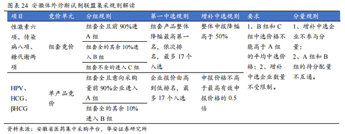 2)外资企业和国产厂商同组竞价,一视同仁。一般来说,外资厂商体外诊断试剂平均出厂价、入院价均高于国产同类产品。本次集采不再区分国产和外资,将所有厂商先按照 90%报量进行分组,之后一并纳入相同的价格体系进行降幅排名,组内的国产厂商相比外资厂商更容易排在靠前中选位置,这也是本次集采能够利好国产、加速国产替代进口的核心机制。