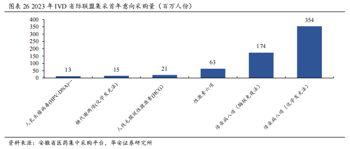 1)本次带量采购参与省份众多,选取的试剂品种具有代表性。从官方公布的文件看,此次集采首年意向采购量达到 6.4 亿人份,传染病八项(化学发光法)需求量 3.5 亿人份,整体占比超过 55.4%。从集采品种来看,既包括国产率较高的传染病八项,也包含国产率较低的性激素六项,分别代表了完全不同竞争格局下的集采试验,本次集采落地也为今后的其他体外诊断项目的进一步集采树立了行业标准。