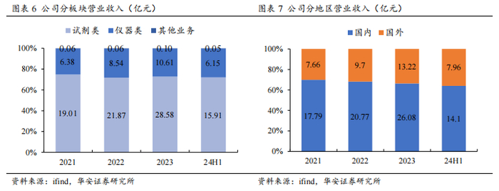 仪器收入占比增加,国内海外双轮驱动。公司主营业务按照类型可以分为试剂类、仪器类,其中仪器类装机量的提升可以带来试剂耗材的持续收入。2023 年以来,公司化学发光仪器及试剂收入同步提升,主要受益于 X6、X8 系列仪器装机量迅速铺设及带动试剂增长。公司持续提升品牌的全球影响力,继续加大对重点国家的本地化建设,公司 24H1 新设印度尼西亚海外子公司,截至目前公司已在海外 10 个重点国家设立全资子公司,本地化运营将加快推动海外重点区域业务的增长。随着公司在俄罗斯、巴西等地设立子公司,海外业务有望进一步加速。2023 年海外收入 13.22 亿元,同比增长 36.23%;2024 年 H1 海外收入 7.96 亿元,同比增长 22.79%,其中海外试剂业务收入同比增长 29.11%,高于海外业务整体增速,增长趋势良好。