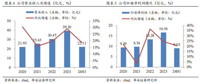 营业收入逐年提升,净利润增速亮眼。公司营业收入在 2018-2023 年期间年均复合增速为 23%,2024 年 H1 营业收入 22.11 亿元(同比增长 18.54%)。归母净利润保持高速增长,2023 年全年达到 16.54 亿元,同比增速 24.53%;2024 年 H1 归母净利润 9.03 亿元,同比增长 20.42%。2024H1 稳定增长,盈利能力稳步提升。