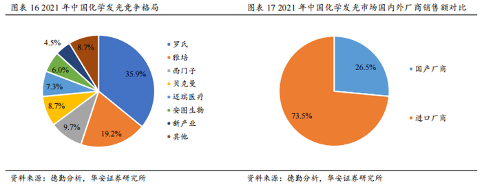 我国化学发光市场存在国产替代逻辑,2021 年国产化率不足 30%。据德勤分析,2021 年中国化学发光市场仍被几家海外巨头(罗氏、雅培等)占据大头,国产厂商中迈瑞医疗仅占 7.3%,安图生物仅占 6%,国产厂商总份额加总不到 30%。我们认为,随着国内带量采购政策的不断推行和落地,国产替代进口的进程会逐渐加快。