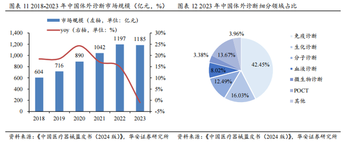 2023 年中国体外诊断(IVD)市场规模超 1000 亿元。体外诊断(IVD)是指在人体之外通过对人体的样本(如血液、体液、组织等)进行检测而获取临床诊断信息的产品和服务。体外诊断是临床医学诊断、治疗及预防等医疗决策的基础,目前体外诊断结果对临床医疗决策的影响超过 70%,是临床医生决定后续治疗方案的科学依据。根据《中国医疗器械蓝皮书(2024 版)》数据显示,2023 年我国体外诊断市场规模已达到 1185 亿元,2018-2023 年均复合增长率约 14.43%。