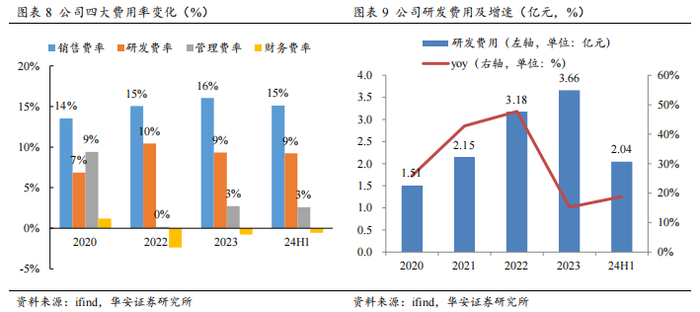 费用控制趋于合理,研发投入持续增加。公司持续完善供应链,把控原料本土化进程,做到有效控制成本,同时关注国内外运营成本,四大费用控制合理且稳定;根据公司 2024 年半年度数据,销售费率/研发费率/管理费率/财务费率分别为 15%/9%/3%/-1%。2020 年以来,公司持续加大研发费用投入,每年均呈现不低于 10% 的同比增长,其中 2024H1 公司研发费用投入高达 2.04 亿元,同比增长约 19%。由于公司持续加码研发投入,近年来公司试剂种类不断丰富,同时凝血、生化、分子等新机型相继推出。
