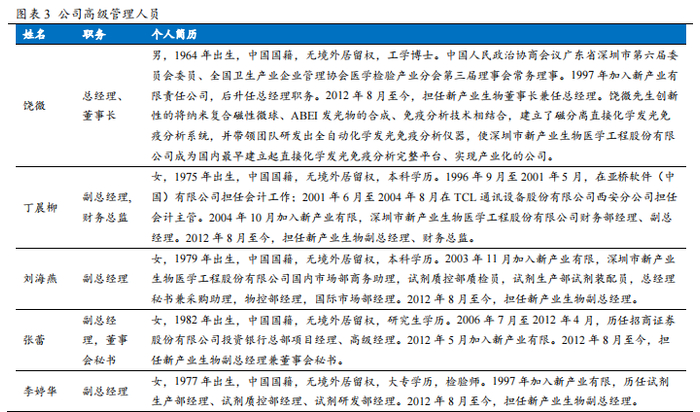 自研产业化,成就国内发光免疫分析平台先驱。饶微先生是公司董事长兼任总经理,工学博士。饶微先生基于学术研究经历创新地将纳米复合磁性微球、ABEI 发光物的合成、免疫分析技术相结合,带领团队成功研发出全自动化学发光免疫分析仪器,并推进该产品的商业化拓展。此外,公司高管成员稳定,多数已在公司任职 10 年以上。
