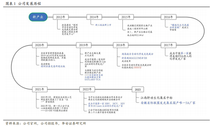 公司发展历程:深圳市新产业生物医学工程股份有限公司成立于 1995 年,是专业从事体外诊断产品研发、生产、销售及服务的国家级高新技术企业。公司自成立起专注于化学发光免疫分析领域的研究,经过多年发展其业务范围已囊括免疫诊断、生化诊断、分子诊断和凝血检测四类,占据了体外诊断产品(以下简称“IVD”)六大板块中四个主要细分市场。