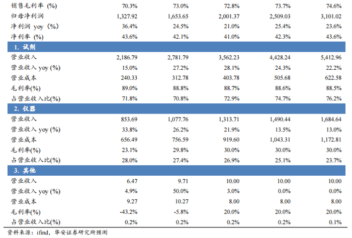 我们预计公司体外诊断仪器业务收入呈现稳步增长态势,基于以下推测:1)国内市场预计 2024-2026 年每年新增装机 2000 台,中大型仪器新增占比提升带来单产持续提升;2)海外市场预计 2024-2026 年年均新增装机 3500 台,中大型仪器新增占比带来单产持续提升。我们预期公司 2024-2026 年体外诊断仪器业务营业收入分别为 13.14 亿元、14.90 亿元、16.85 亿元,同比增速分别为 21.9%、13.5%、13.0%。
