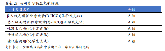 安徽联盟集采结果:公司是国产唯一 5A 厂家。2023 年 12 月 8 日,安徽医保局发布体外诊断试剂二十五省(区、兵团)的省际联盟集采(发光集采)结果公示。此次集采被视为 2021 年安徽试点的推广,本次集采项目包括 β 人绒毛膜促性腺激素(B-HCG)、总人绒毛膜促性腺激素(总-HCG)、性激素六项、传染病八项、糖代谢两项。