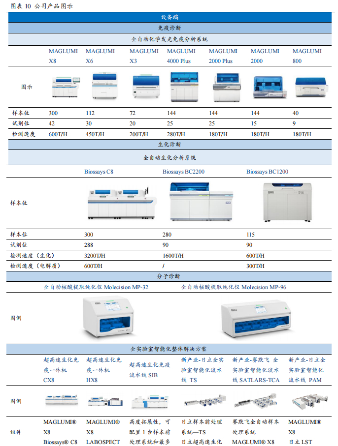 公司深耕化学发光领域十余年,仪器测速和性能处于行业领域地位。公司设备端方面,拥有齐全的产品管线,化学发光免疫分析系统 MAGLUMI X8 性能强劲:(1)拥有全球第一梯队的检测性能和检测位;(2)故障率接近零,10 万测试无报警,100 万个测试只换一根导线;(3)稳定性好,CV 值可以做到 2.5%左右(大部分进口的一般在 8%左右,最好的可以做到 5%)。2023 年公司借助自研的 MAGLUMI® X8、Biossays® C8 全自动生化分析仪和全自动样本处理系统发布了全球顶级的生化免疫流水线。