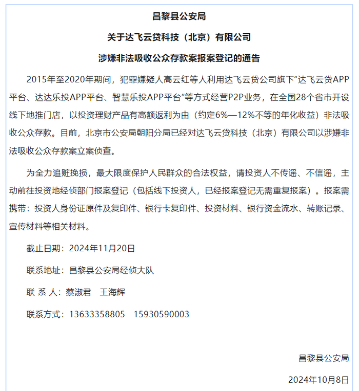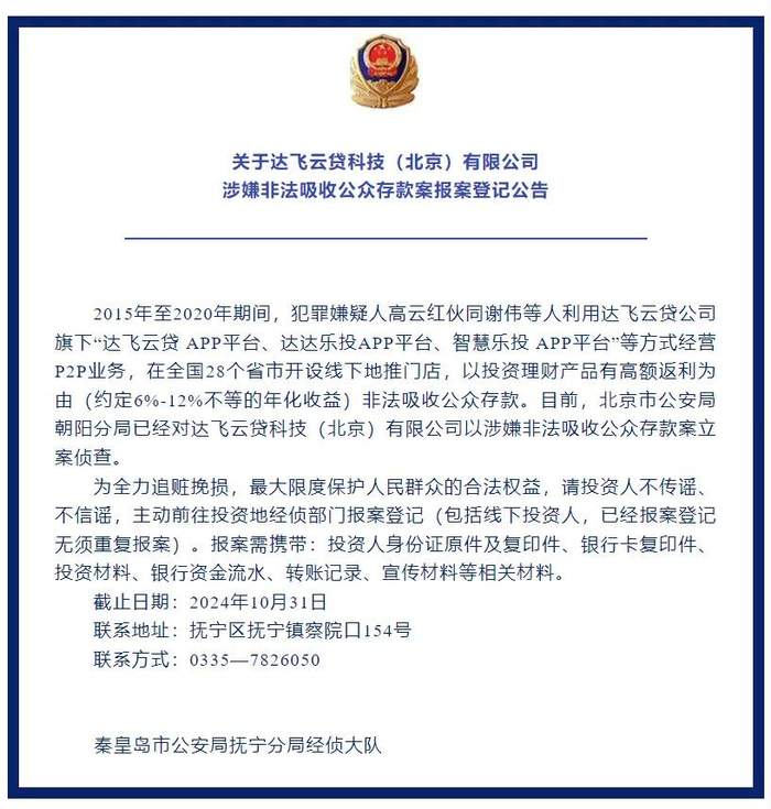 2024年10月8日,昌黎县公安局发布《关于达飞云贷科技(北京)有限公司涉嫌非法吸收公众存款案报案登记的通告》