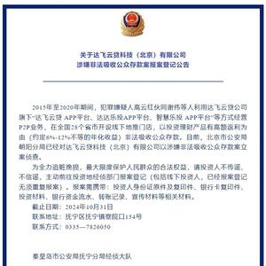 近日,秦皇岛警方发布《关于达飞云贷科技(北京)有限公司涉嫌非法吸收公众存款案报案登记公告》。