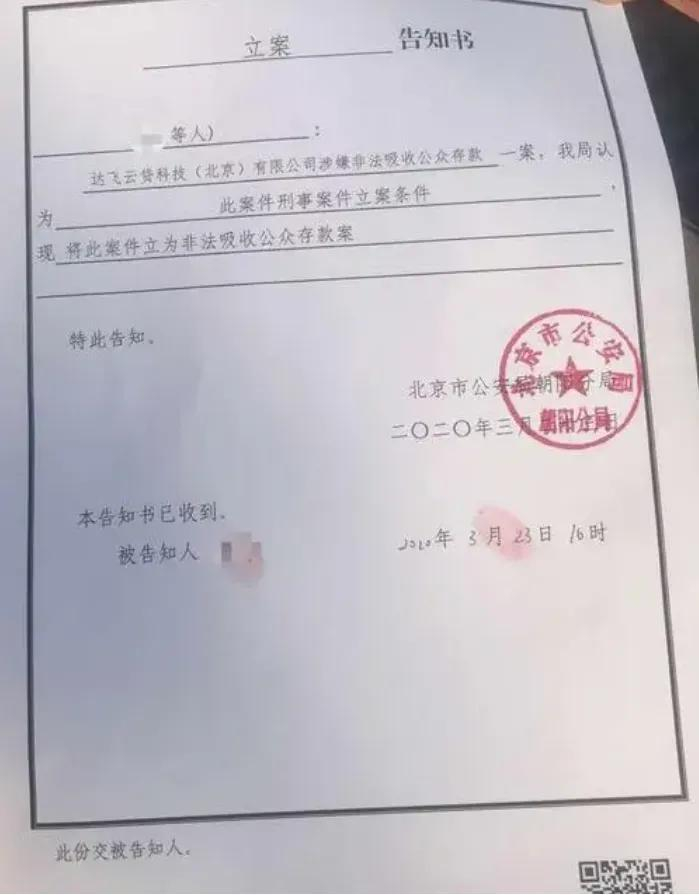 据网传《立案告知书》,北京朝阳分局警方称,“达飞云贷科技(北京)有限公司涉嫌非法吸收公众存款一案,我局认为此案件刑事案件立案条件,现将此案件立为非法吸收公众存款案,特此告知。”