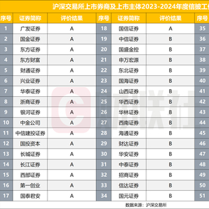 根据沪深交易所发布的评价结果,其中,共计18家上市券商及上市主体获最高等级A类评价,获得A类评级的上市券商占比超三成。包括中信建投证券、中金公司、国泰君安证券、银河证券、华泰证券、国金证券、浙商证券、兴业证券、东方证券、财通证券、国投资本、广发证券、东方财富、国信证券、长城证券、长江证券、西部证券、第一创业证券。