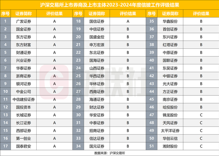 具体来看,信息披露工作考核覆盖了51家上市券商及上市主体。上交所上市券商评级结果为A的包括中信建投证券、中金公司、国泰君安证券、银河证券、华泰证券、国金证券、浙商证券、兴业证券、东方证券、财通证券、国投资本;深交所上市券商评级结果为A的分别有广发证券、东方财富、国信证券、长城证券、长江证券、西部证券、第一创业证券。评级结果为B的上市券商及上市主体共计28家。评级结果为C的上市券商及上市主体仅有5家,分别为天风证券、太平洋证券、华创云信、湘财股份、锦龙股份。