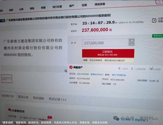 司法拍卖平台显示,广东新南方建设集团持有的潮州农商银行的8800万股的股权被拍卖,竞买公告未提及该股权的评估价,直接以2.376亿元起拍,相当于每股2.7元。