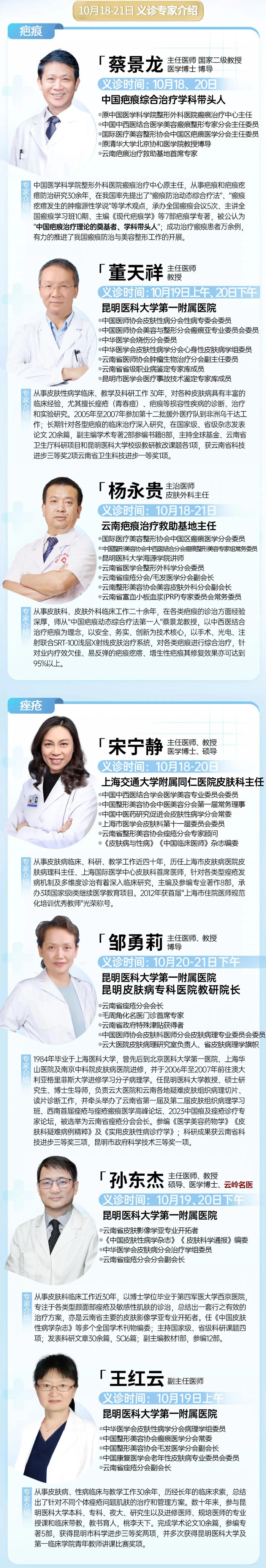 政策说明:10月18-21日,主办方指派北京、上海、云南各三甲医院专家到大会承办单位昆明皮肤病专科医院出诊,为报名群体免费面诊并制定方案,由该专家亲自治疗、手术;