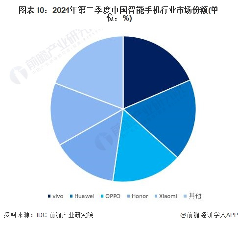 根据IDC数据显示,2024年第二季度,中国智能手机厂商Vvio排名第一,市场份额为18.5%;其次是华为和OPPO,市场份额分别为18.1%和15.7%;小米市场份额约14%。