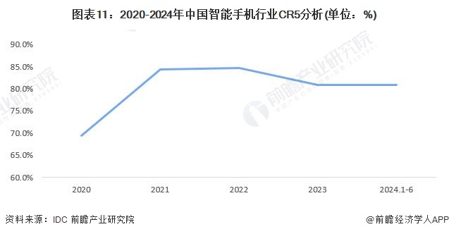 基于IDC公布的市场份额数据,我国智能手机行业市场集中度较高,苹果、Honor、OPPO、Vivo、小米等5家厂商占据了国内大部分市场。2023年中国智能手机行业市场集中度CR5为80.9%,2024年二季度约80.8%,有所下滑。